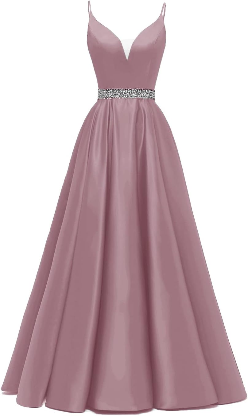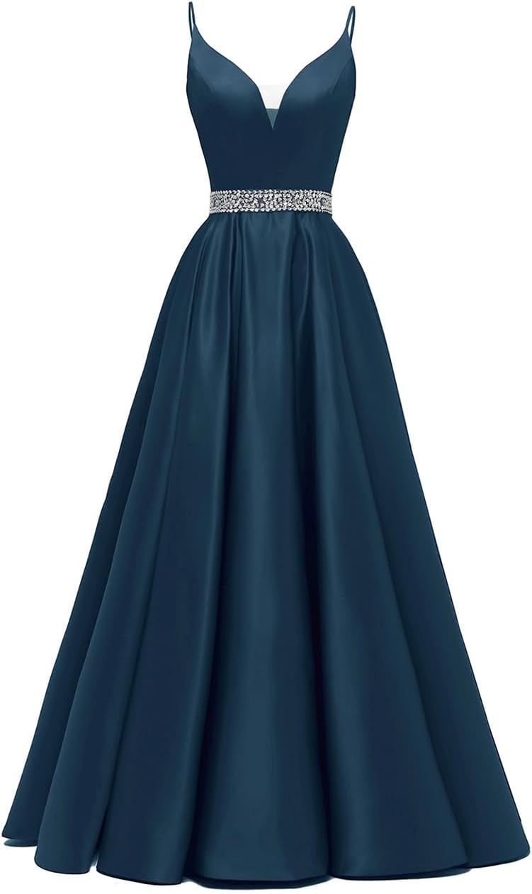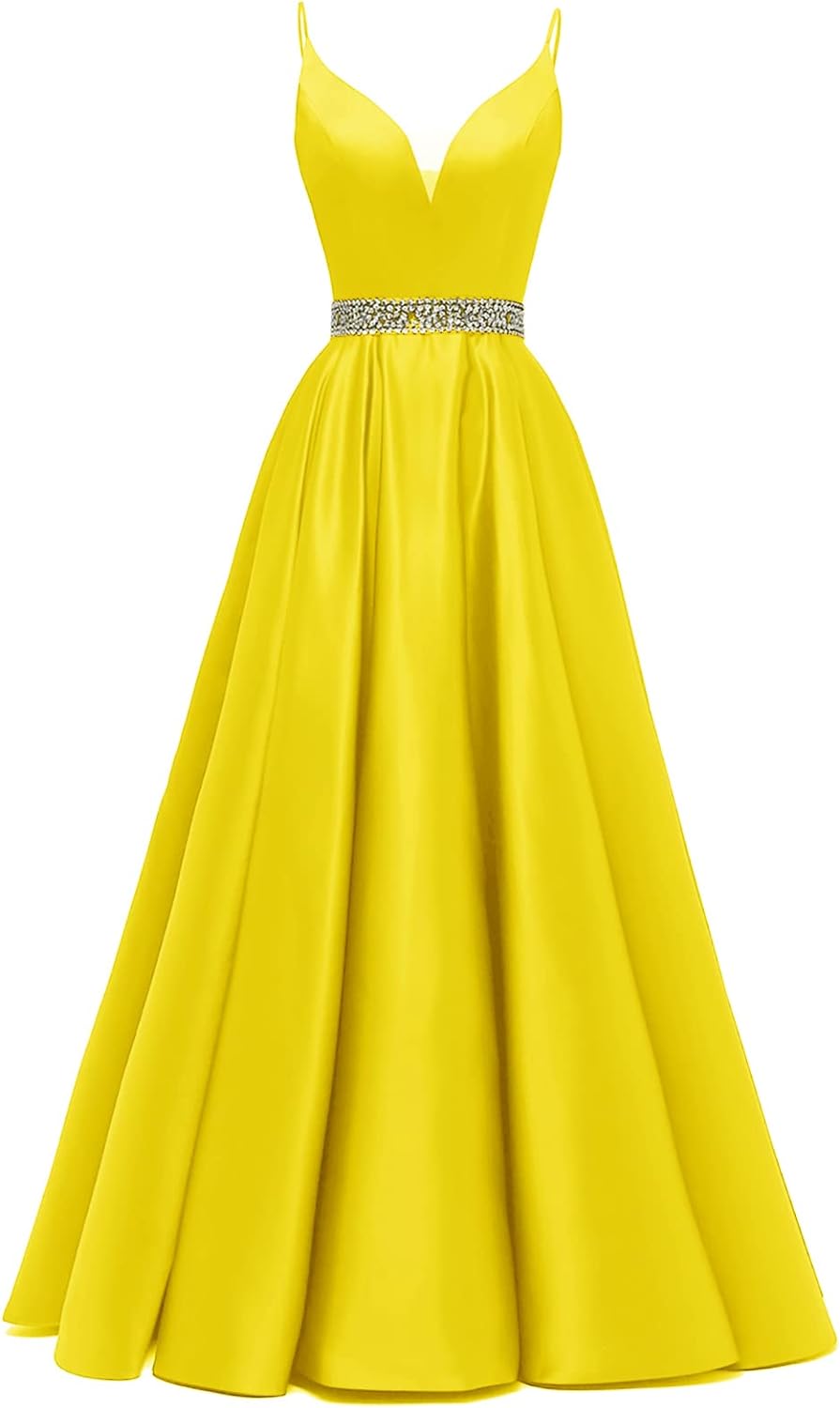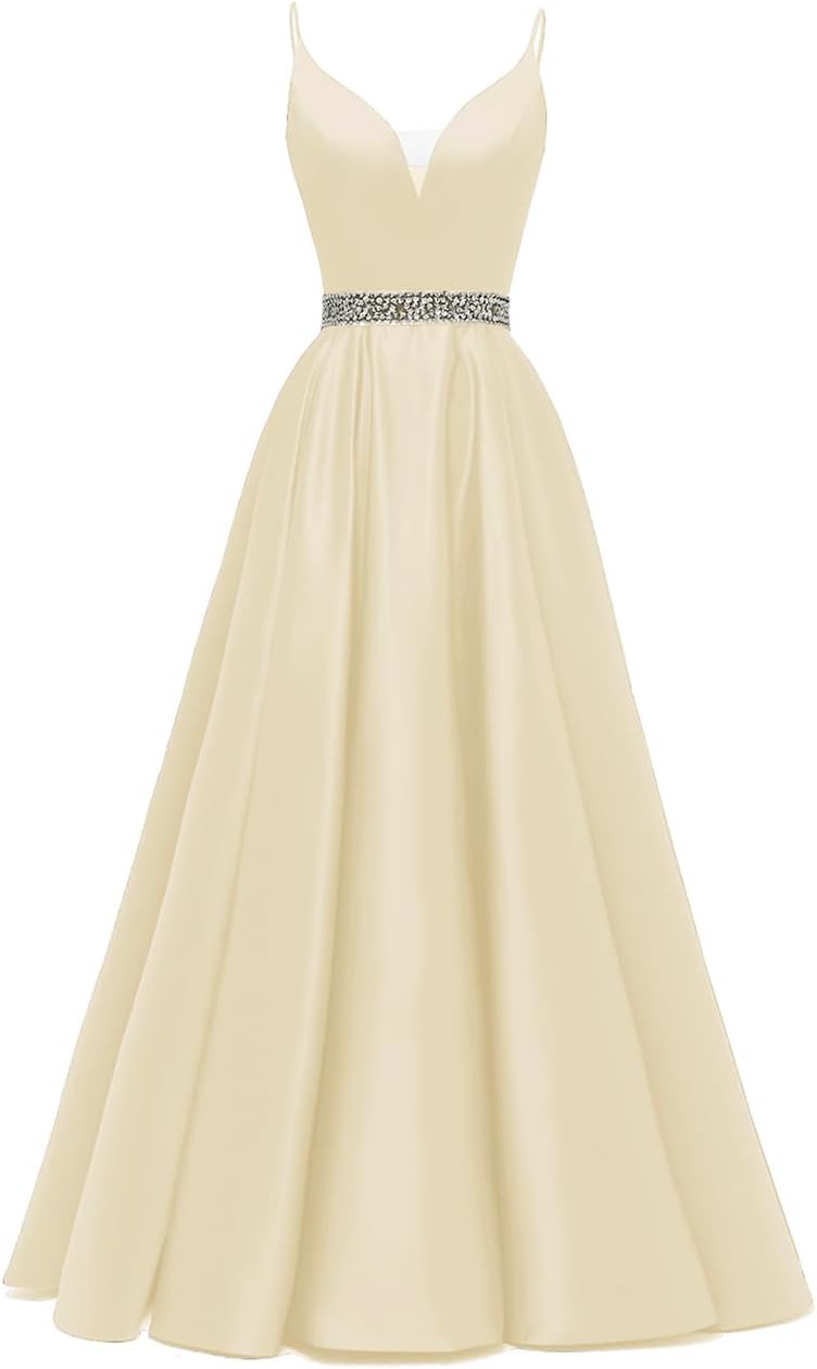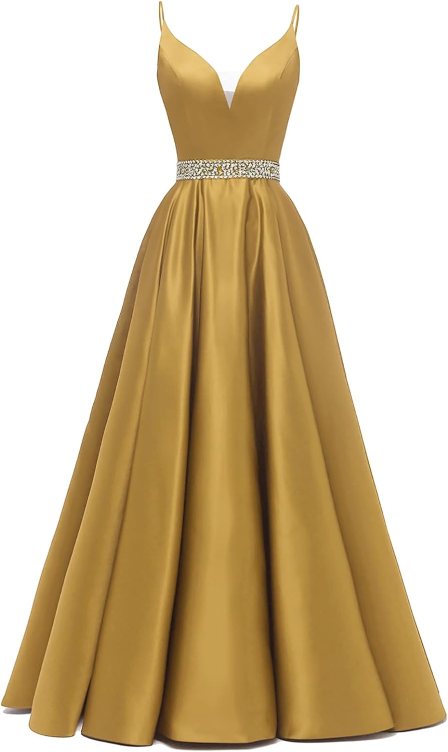 Spaghetti Straps Prom Dress Long Satin Beaded V-Neck Formal Evening Party Ball Gowns with Pockets