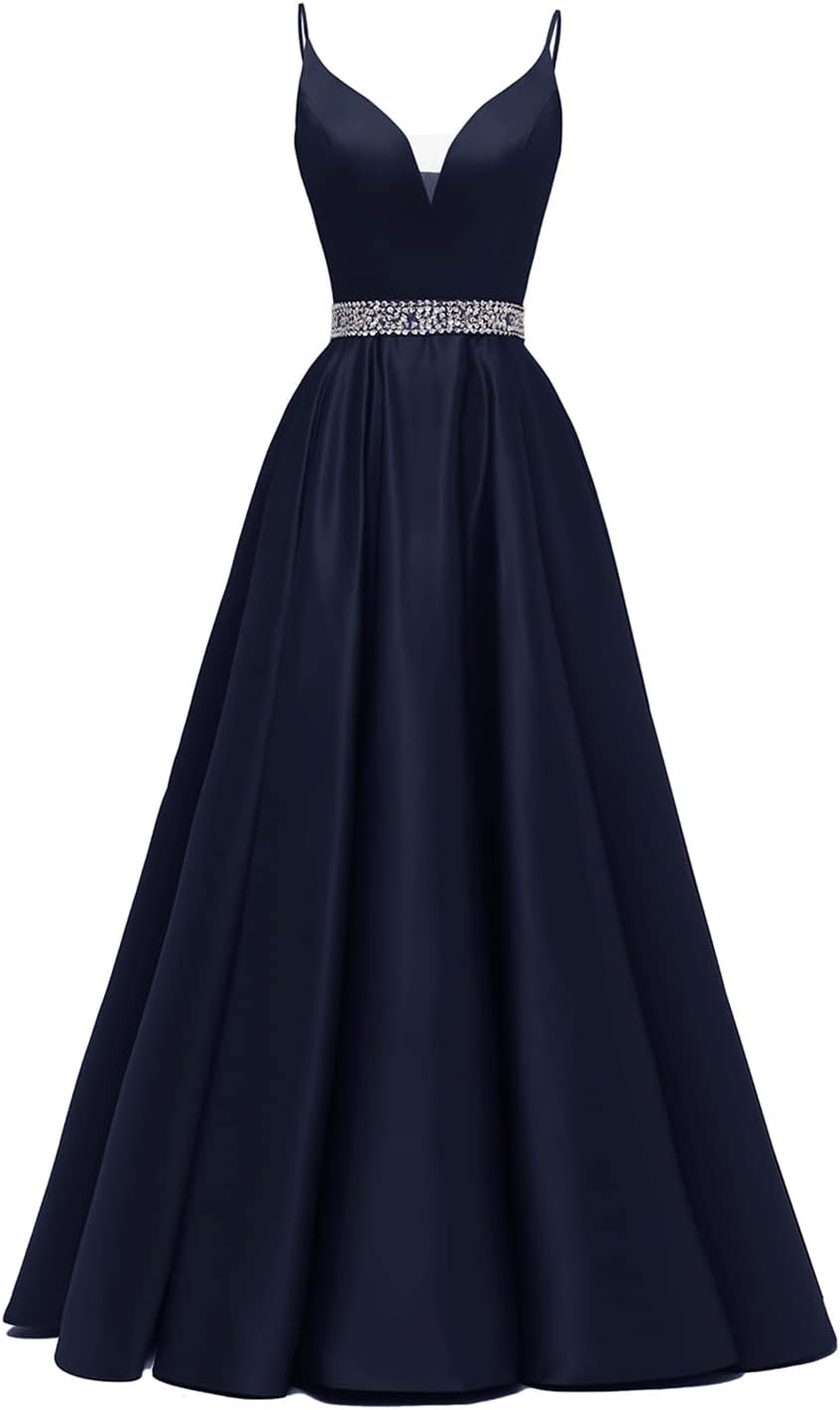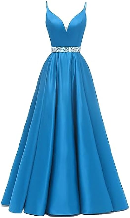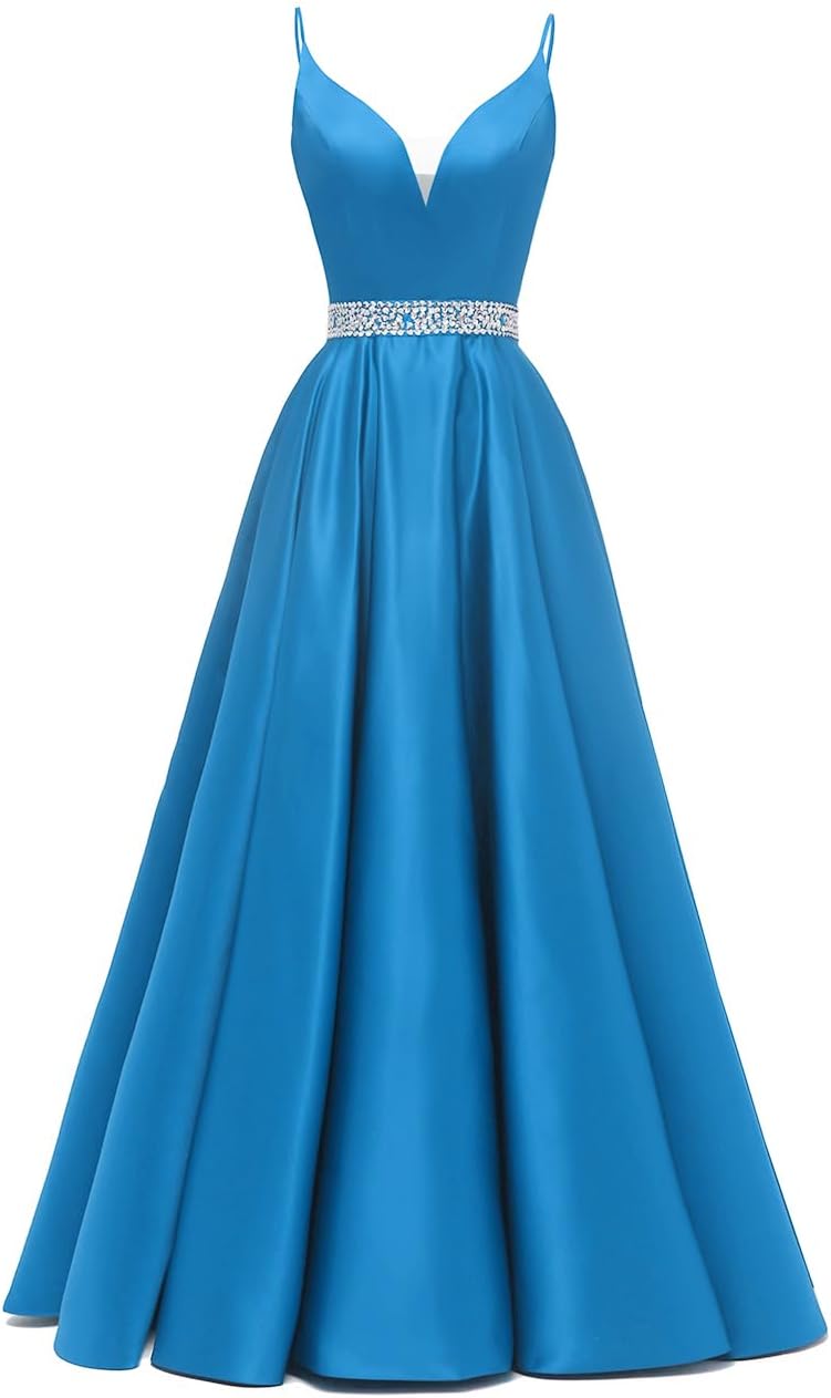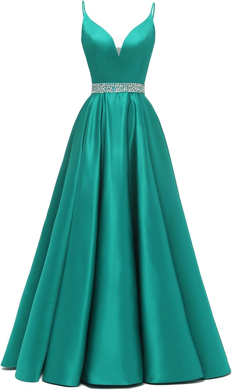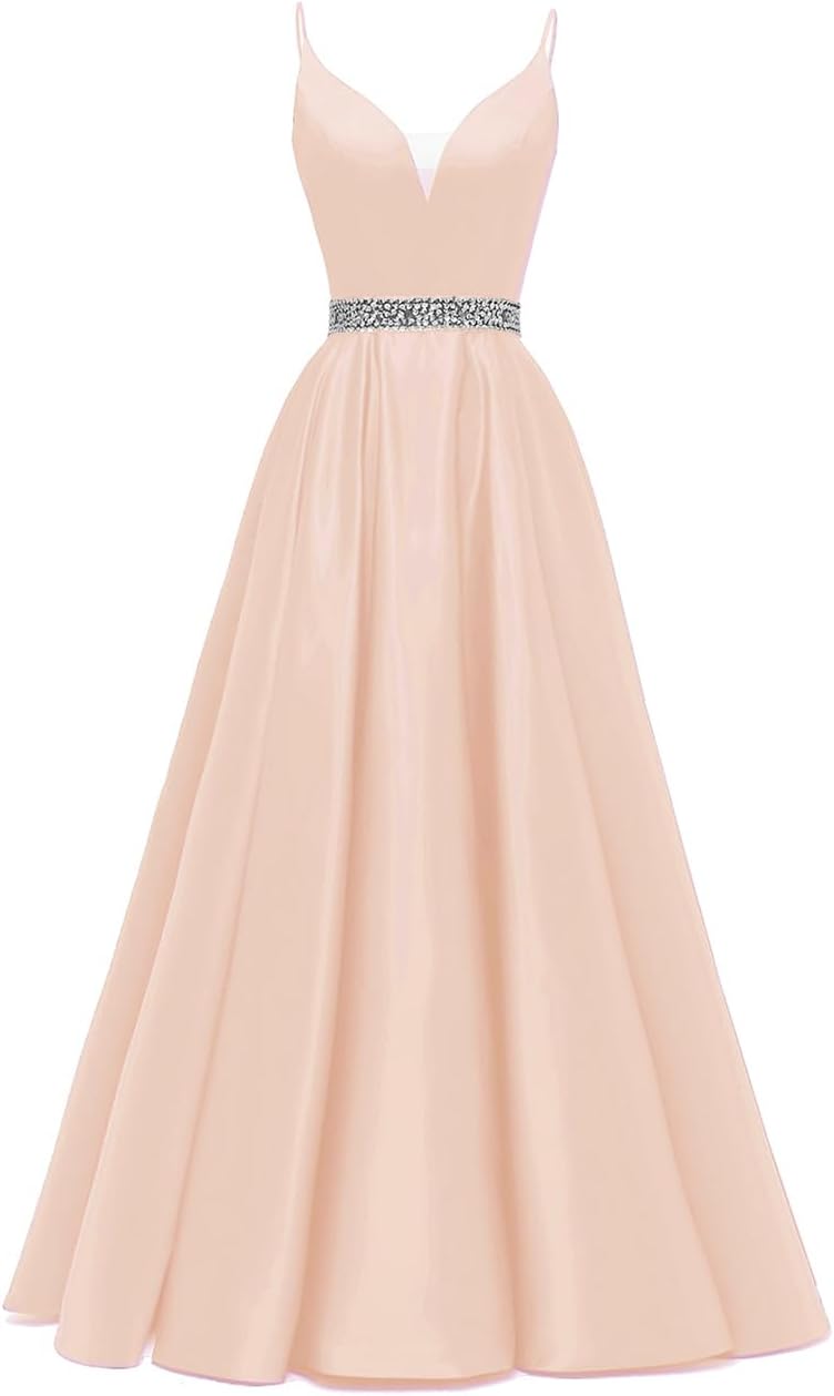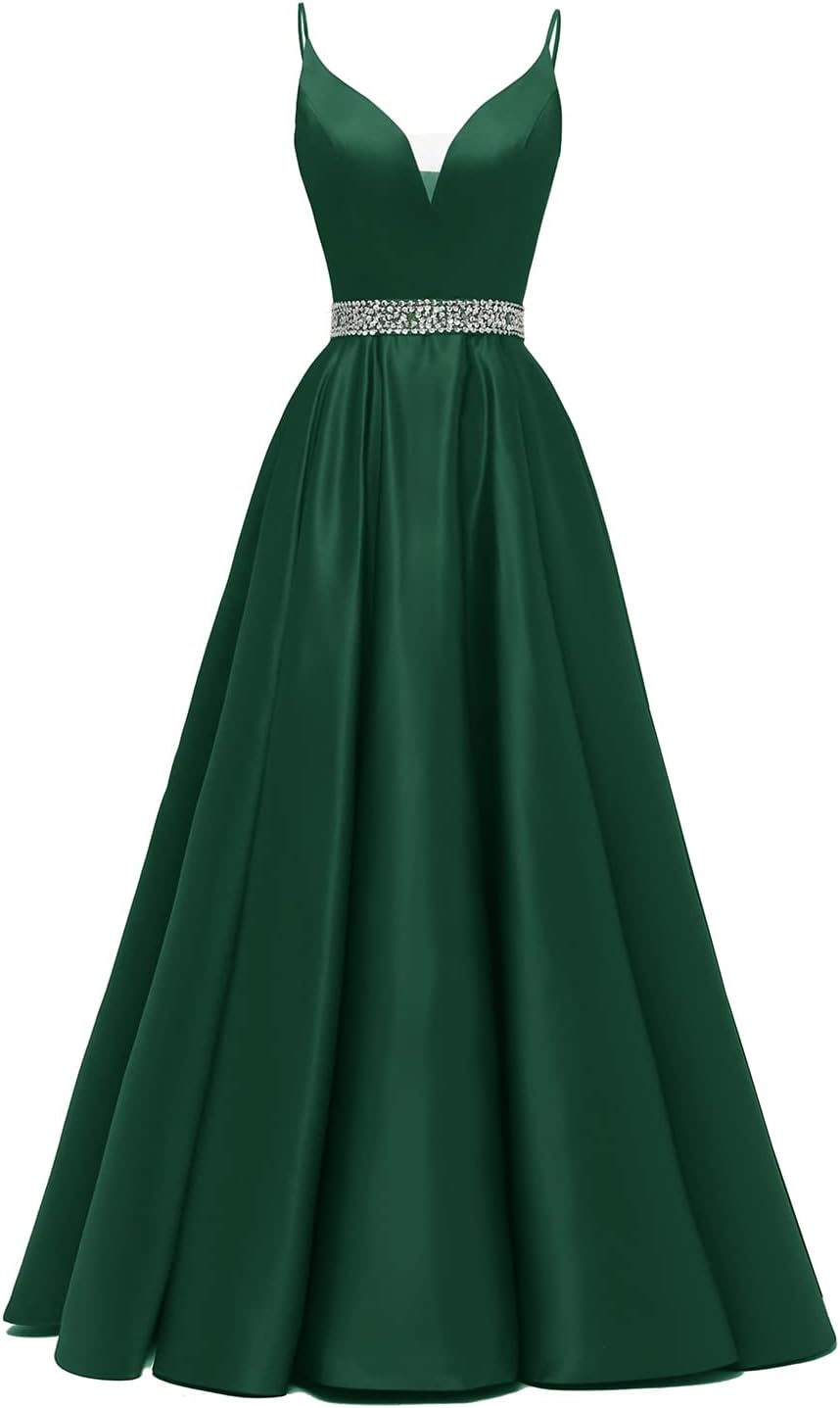 Spaghetti Straps Prom Dress Long Satin Beaded V-Neck Formal Evening Party Ball Gowns with Pockets