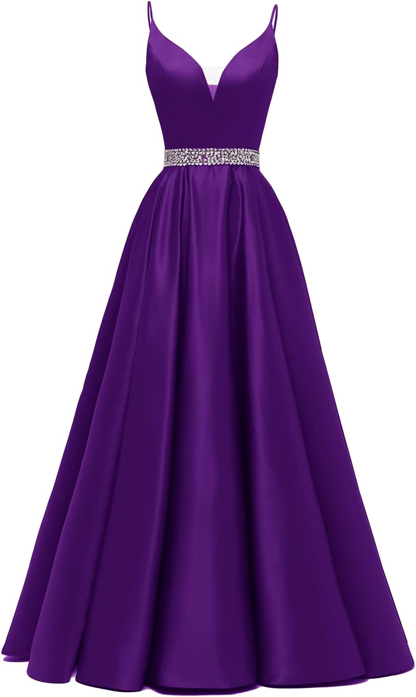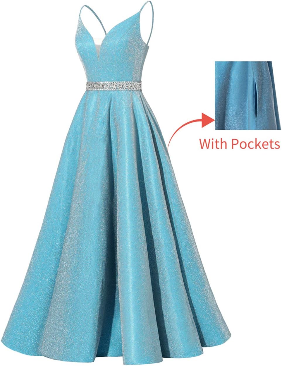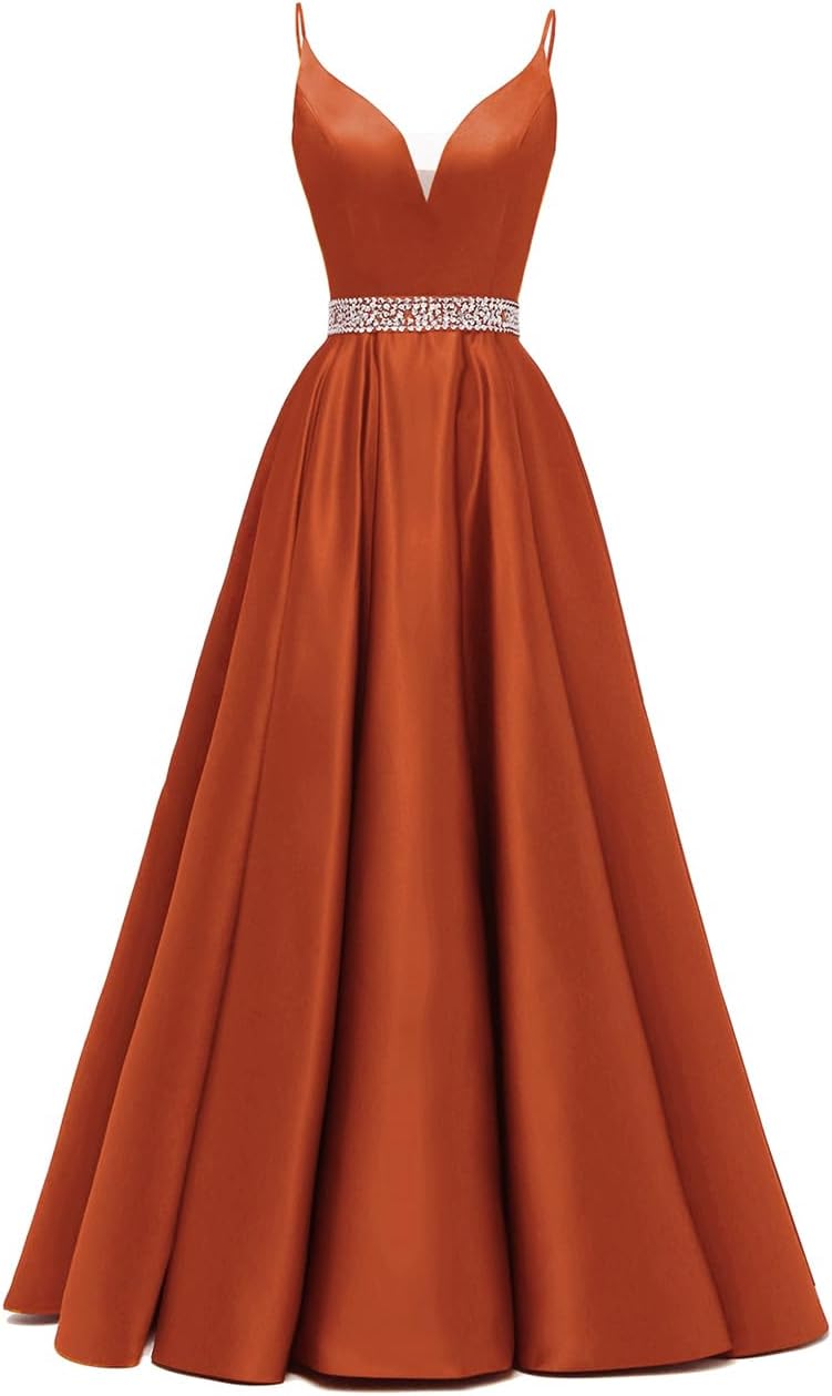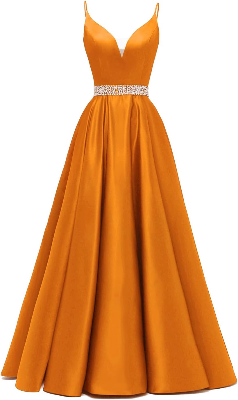 / Spaghetti Straps Prom Dress Long Satin Beaded V-Neck Formal Evening Party Ball Gowns with Pockets