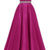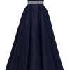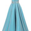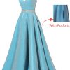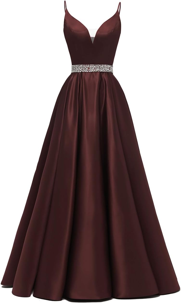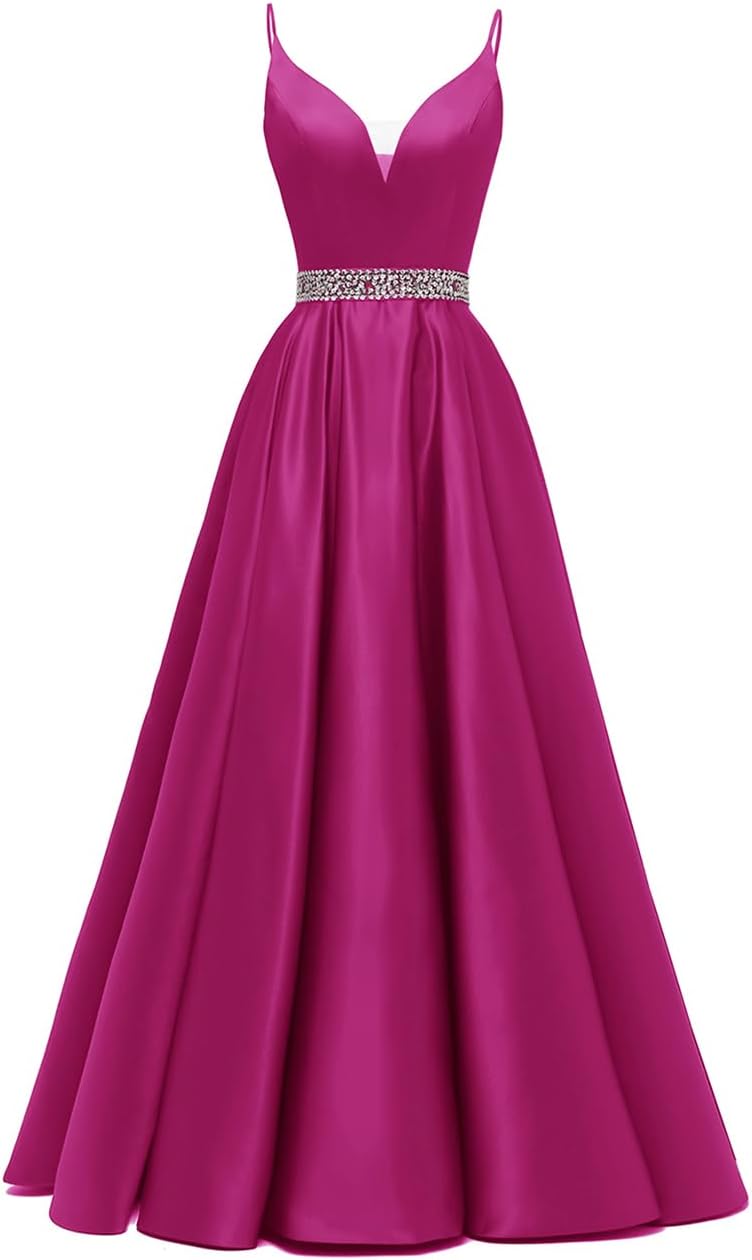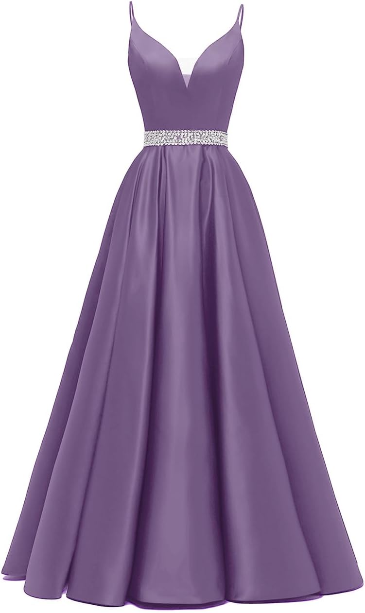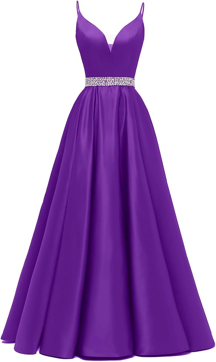 / Spaghetti Straps Prom Dress Long Satin Beaded V-Neck Formal Evening Party Ball Gowns with Pockets
